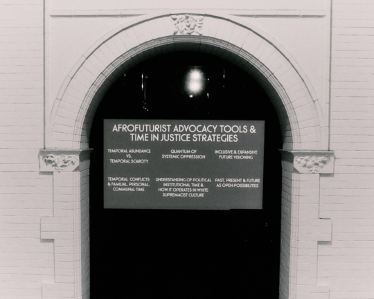This resonates with Black Quantum Futurism’s reimagining of space-time itself, where marginalized communities’ temporal experiences, their ancestral memories and future visions, challenge Western linear chronology and create what Camae Ayewa and Rasheedah Phillips of Black Quantum Futurism, term “community futures.” Such alternative temporal logics found expression at Buro Stedelijk through Manifestation #76 Cosmic Entanglements, where Black Quantum Futurism’s documentation of the Time ZoneProtocols (TZP) Surveyors group examined how colonial time standards lock Black communities out of past and future, confining them to a narrow temporal present. The film’s presentation within the ‘Goddess Change’ speculative fiction reading group, convened by artists Anna Hoetjes and Müge Yılmaz, exemplified how project spaces can host practices that examine new relationships to space-time through specific social, geographical, and cultural frameworks departing from colonial linearity.